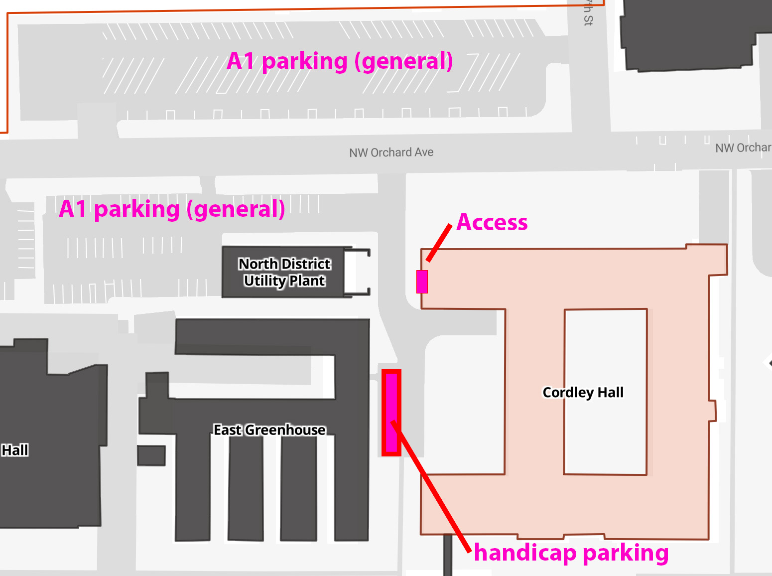 The most convenient parking will be either the parking lot on Orchard Ave (signs = A1 lots), and there are some handicap spots directly to the west of cordley hall (visible on map)